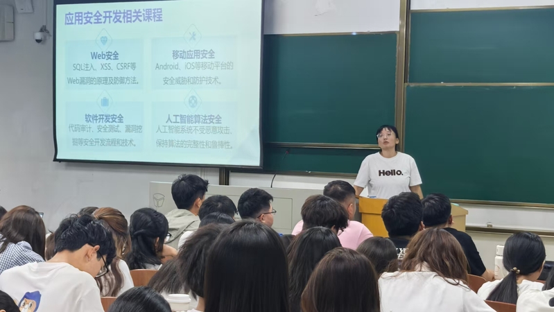 活动中,李会格老师生动地介绍了信息安全专业的概况、内涵与前景。她指出,随着数字化转型不断深入和网络安全威胁持续升级,信息安全已成为保障国家战略、企业运营与个人隐私的核心支撑。该专业融合计算机科学、网络通信、密码学等多学科知识,致力于培养既懂理论又重实践的高素质工程技术人才。李老师通过展示近年来发生的一系列网络安全事件,生动阐述了信息安全面临的现实挑战与战略意义,让新生们意识到信息安全的重要性。在核心课程讲解环节,李老师围绕密码学、网络安全、软件安全等核心课程进行了深入浅出的解读。她介绍了非对称加密、对称加密、数字签名等密码学算法,以及网络攻击防御、操作系统和数据库安全配置、云计算安全等网络与软件安全知识,帮助新生建立起清晰的专业知识框架。