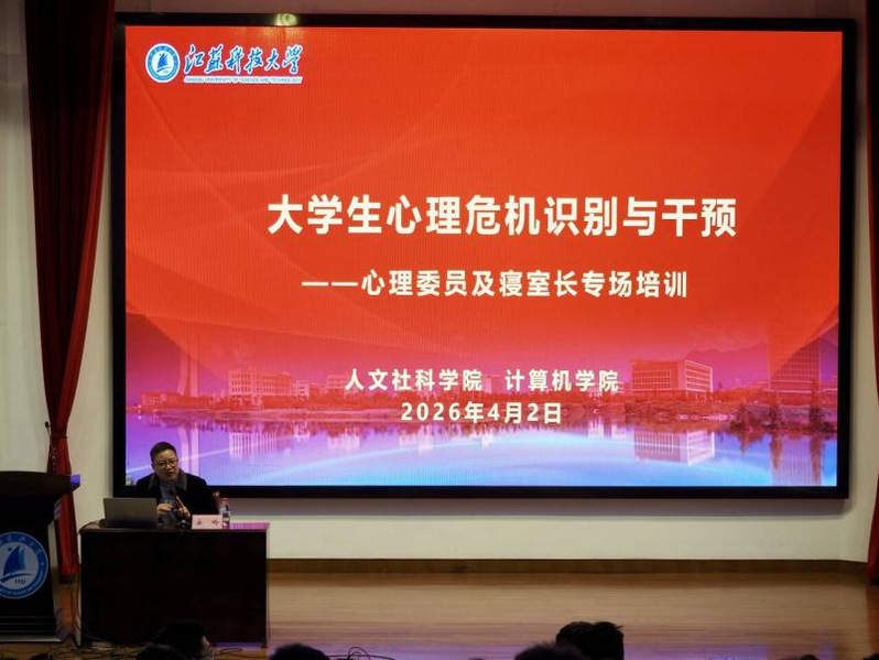 为落实“健康第一”教育理念,进一步加强心理健康教育工作,提升班级心理委员队伍专业素养与实务能力,充分发挥其在班级心理互助体系中的关键作用。4月2日下午,计算机学院海韵书院“一站式”学生社区联合人文社科学院在梦溪校区演讲厅举办“大学生心理危机识别与干预”专题培训。两院全体心理委员、各寝室长共同参与,人文社科学院心理辅导员刘晓静老师主持活动。