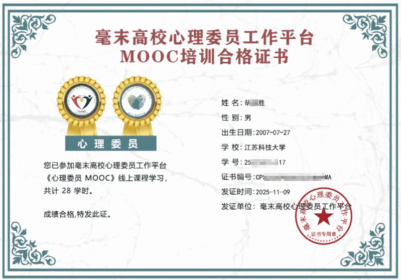 学院组织2025级全体心理委员参与“高校心理委员工作平台”线上MOOC培训,课程包含心理委员职责定位、大学生心理健康诱发因素等14个核心专题。培训采用“视频学习+专题测试”模式,需累计完成28学时学习,测试总分达80分可获认证证书。学院安排学生干部跟进学习进度,线上平台支持断点续播功能,充分适配学生时间安排。目前,全体心理委员均已完成课程学习并顺利通过测试,成功获取培训合格证书,为开展朋辈心理帮扶夯实了理论基础。
